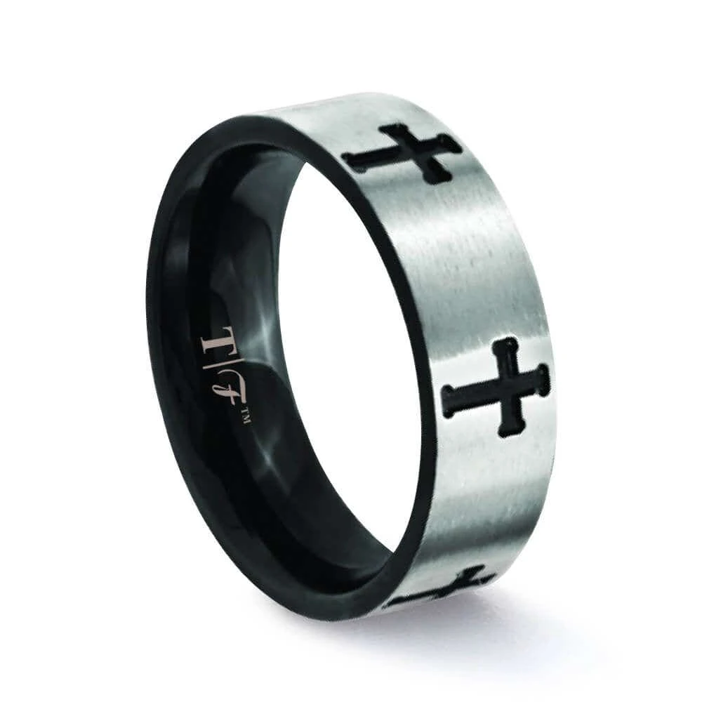 With etched crosses around its circumference and black plating, the CRETE titanium ring’s allure is simple yet stunning. Brushed titanium provides the perfect platform for a ring meant for life’s biggest occasions.
