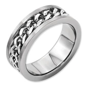 Strength and cutting edge style are hallmarks of the PRAGUE men’s titanium band. High polished, flat titanium band is inlaid with stainless steel chain deisgn. Made in a unique 7mm width, this ring looks great as an everyday ring or a fashion accessory.