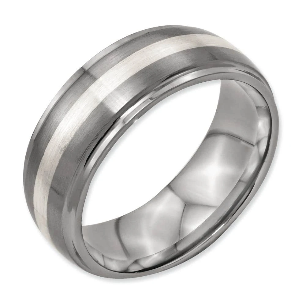 Combining space-age with the classic, the SAN MARINO inlay titanium ring is the perfect marriage of titanium and sterling silver. Rounding out the style of this band is a raised top with brushed finish detail flanked by high polished bevels. Available in 6mm and 8mm widths.