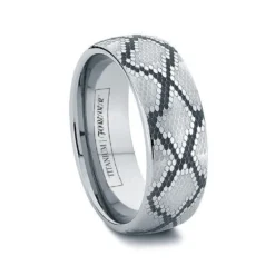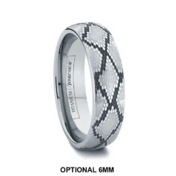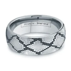 Let this uniquely styled titanium band constrict around your finger and you’ll never want to let go. The SNAKE features an exclusive snakeskin pattern made popular by our tungsten and cobalt chrome versions. Now in high quality titanium, the snakeskin design is added to the titanium exterior by our high precision laser engraving machine. Combine your love of unique patterns with the strength of titanium and you’ll have a fashion statement for the ages.
