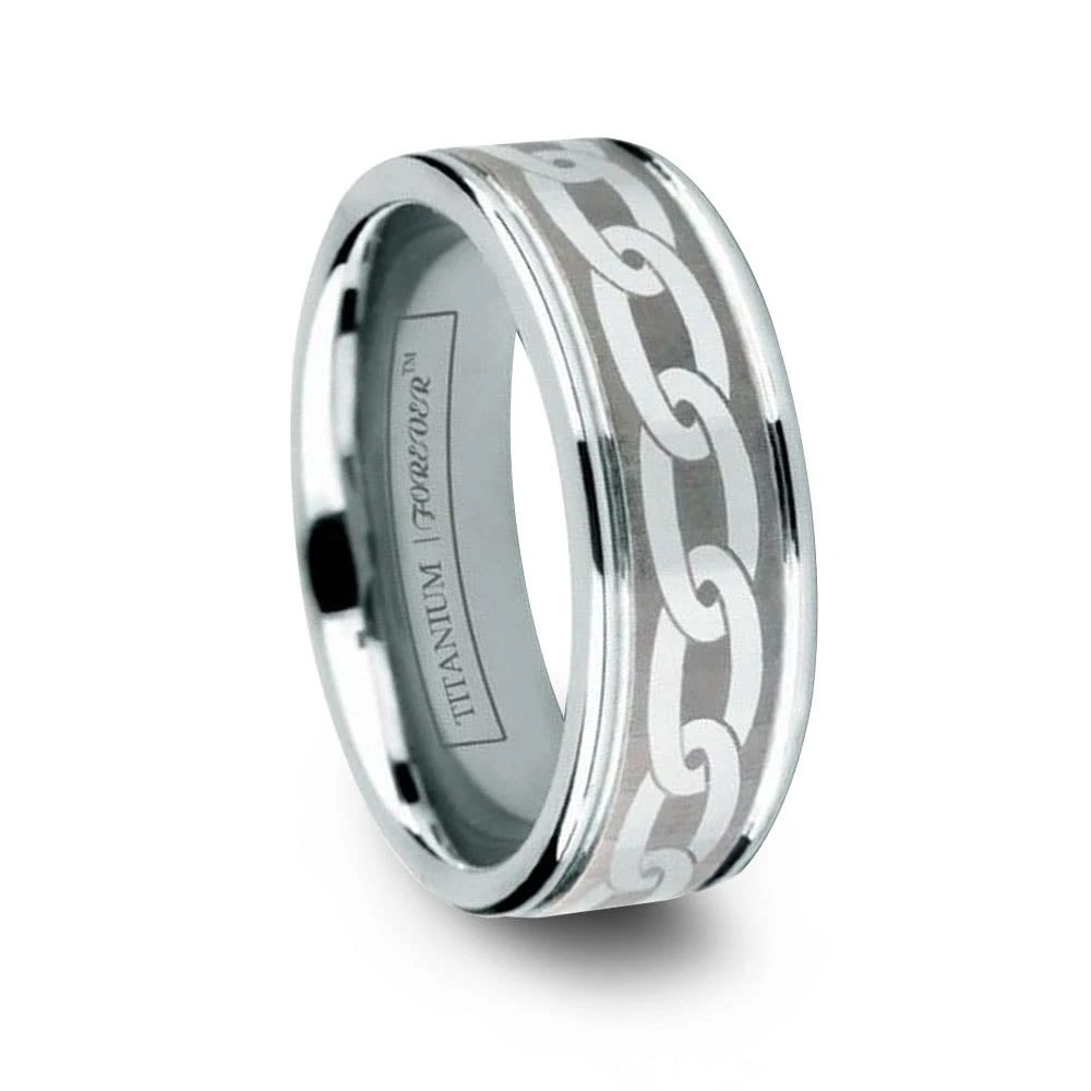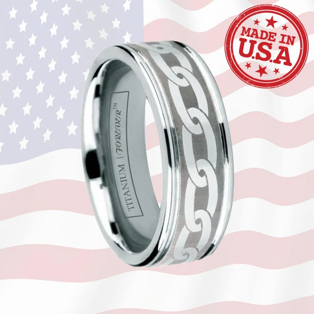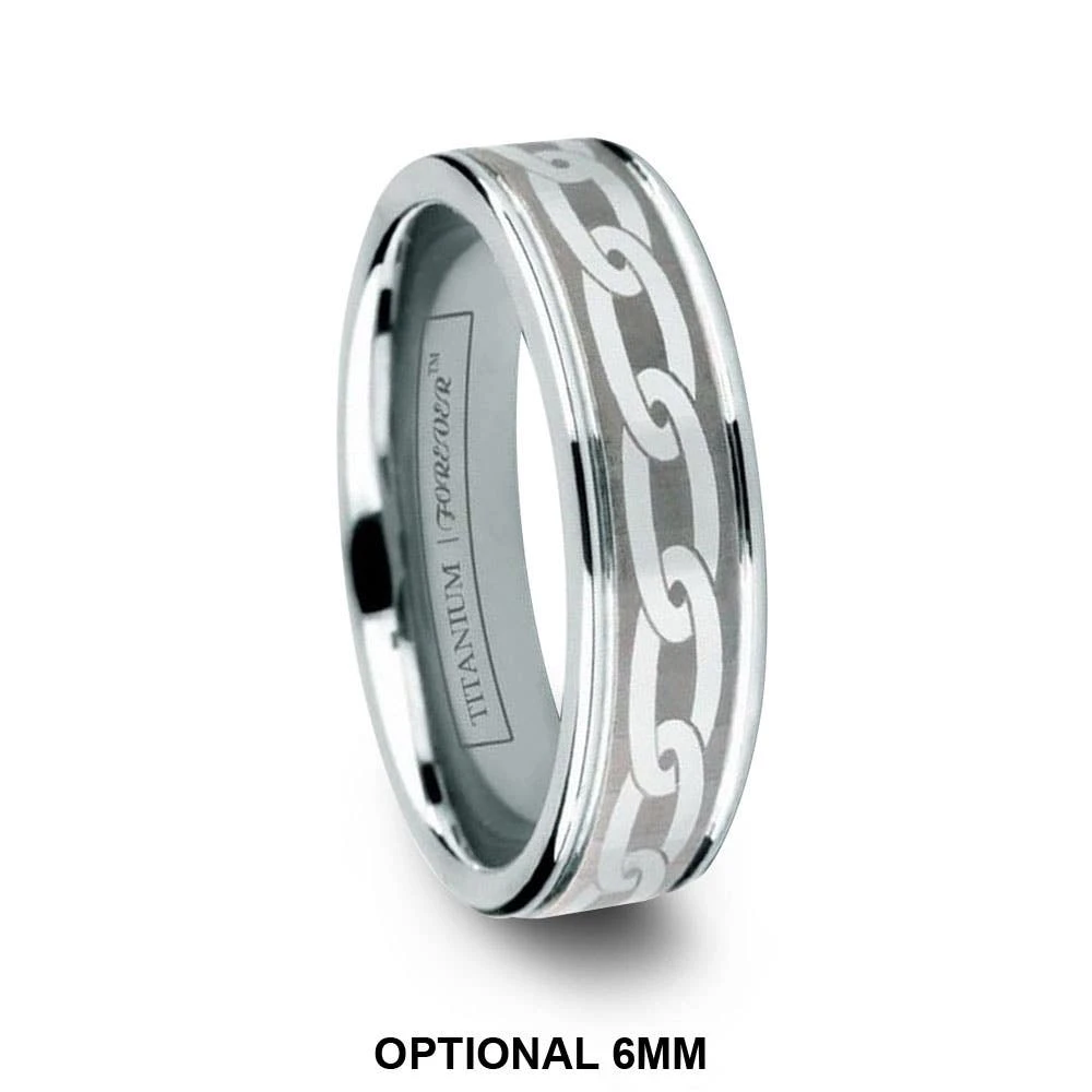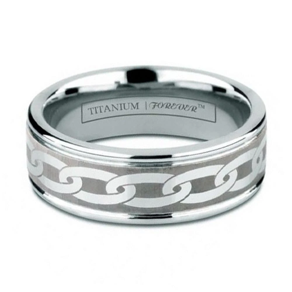 You’re only as strong as your weakest link…. Good thing this metal chain inspired laser engraved men’s titanium wedding band has no weak links! Made from the highest quality titanium, the SPLICE features strength on strength with its rugged chain design. Available in 6mm or 8mm width choices and engraved using our high tech laser engraving machine, whether you’re a biker, motorcycle enthusiast or just love tough rings, this is the band for you.
