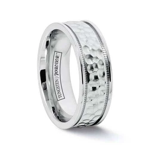 Stunning band style ring with brushed dimpled finish & milgrain on either side. Beautifully crafted hammered ring in white titanium.